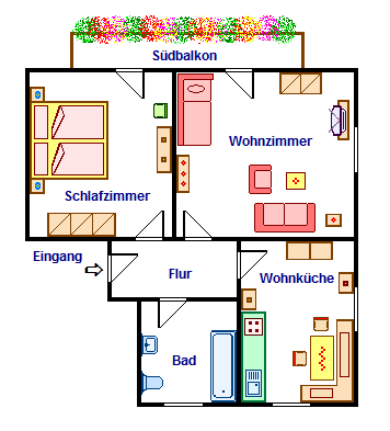 2-Zimmer-Nichtraucher-Wohnung im 1. Stock für 1 – 2 Personen, ca. 50 qm