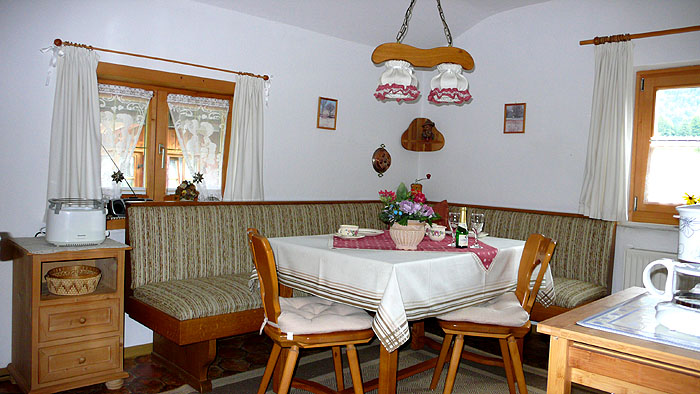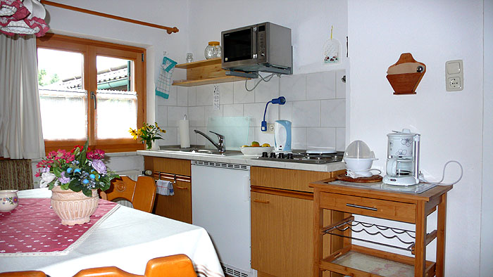- Separate Küche mit 4-Plattenherd, Mikrowelle, Kühlschrank mit Gefrierfach, Kaffeemaschine, Wasserkocher, Toaster, Eierkocher und gemütlichem Essplatz